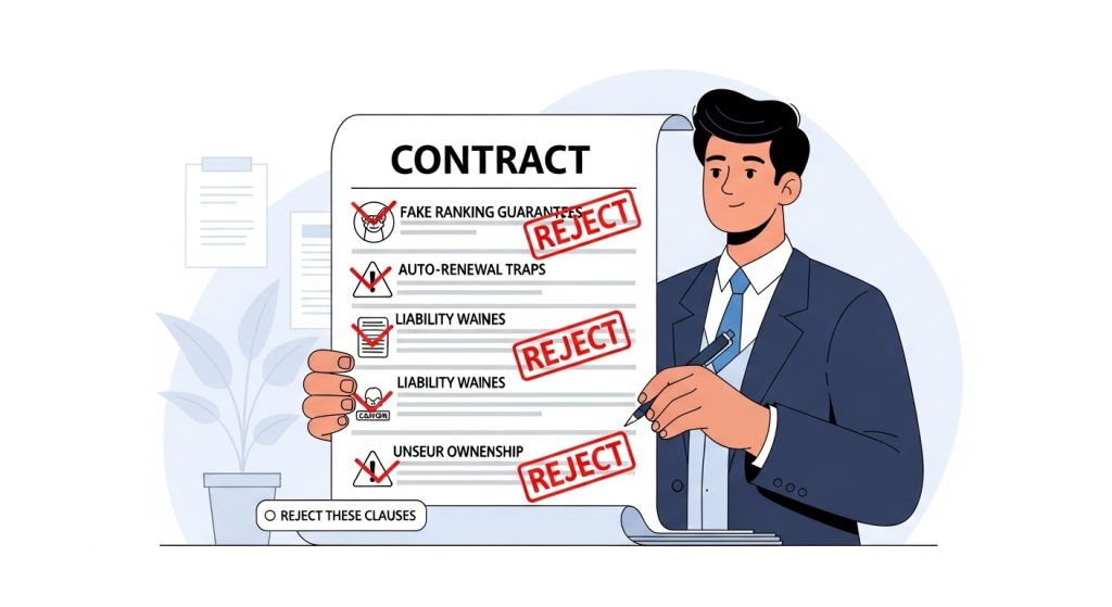 If a contract includes a guarantee of specific rankings or traffic volumes within a set timeframe, reject it. Either the clause is meaningless marketing language, or it signals that the agency plans to use tactics that violate search engine guidelines to deliver the promised result.
